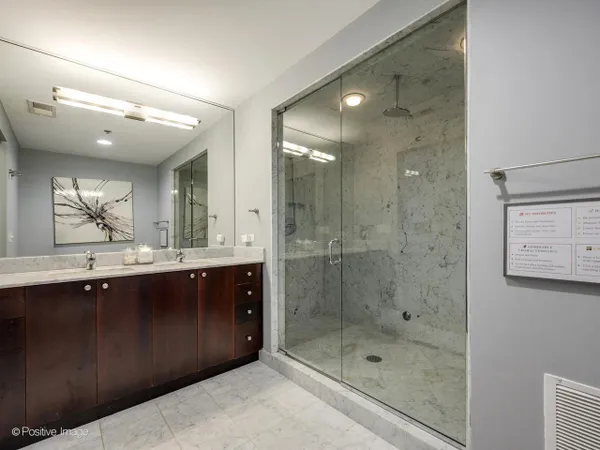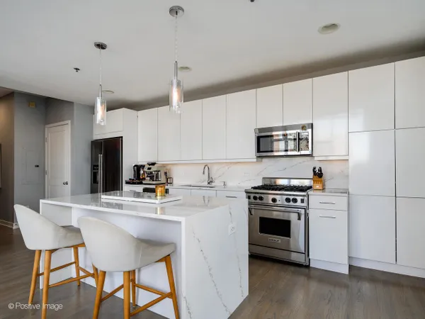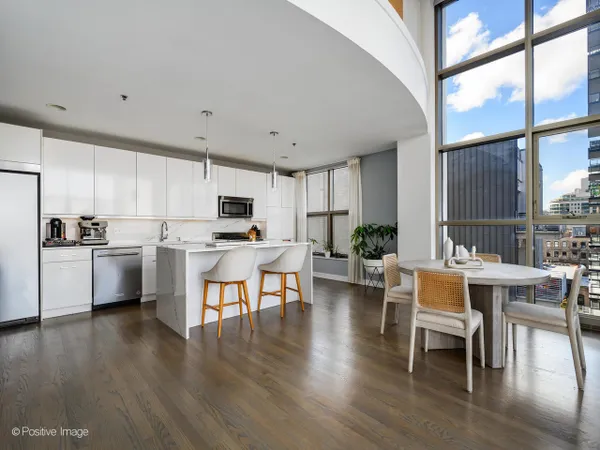 Welcome home to this impeccably updated, truly move-in ready 2 bed, 2 bath corner residence in the heart of River North. Soaring 15-foot ceilings, dramatic floor-to-ceiling windows, and sweeping northwest skyline views define this nearly 1,600-square-foot home, set within an intimate boutique building with 24/7 door staff. Thoughtfully renovated throughout, the stunning designer kitchen (2021) features sleek flat-panel cabinetry, white quartz countertops with a waterfall island, professional-grade stainless steel appliances, added pantry storage, and a rare oversized lofted storage area. The expansive two-story living and dining space is ideal for entertaining, showcasing beautiful oak flooring, a gas fireplace, surround sound, and access to a private balcony with north and east views. The spacious primary suite easily accommodates a king-sized bed and sitting area, and includes a large walk-in closet and spa-inspired marble bath with dual vanity and an impressive 40-square-foot steam shower with built-in speakers. The second bath is elegantly finished in marble with a deep soaking tub. Major updates provide true peace of mind, including the 2021 kitchen renovation, brand-new washer and dryer (2024), refrigerator (2024), dishwasher (2025), and two separate brand-new MagicPak HVAC systems installed in December 2025-making this home both beautifully updated and meticulously maintained. Additional highlights include a custom-organized entry closet, 120-inch ceiling-mounted projector screen, Nest thermostats, automatic blinds, private storage, and bike storage. Deeded attached garage parking is available for an additional $30,000. Unbeatable River North location just steps from Michigan Avenue, the Riverwalk, East Bank Club, Mag Mile shopping, top restaurants, parks, and CTA. A rare opportunity to own a fully upgraded, turnkey home in one of Chicago's most sought-after neighborhoods.