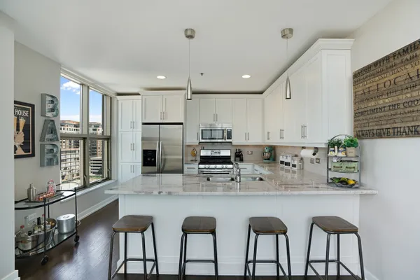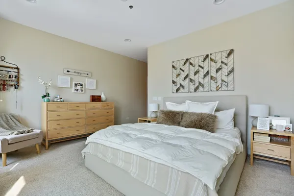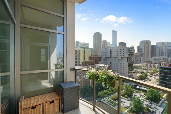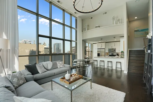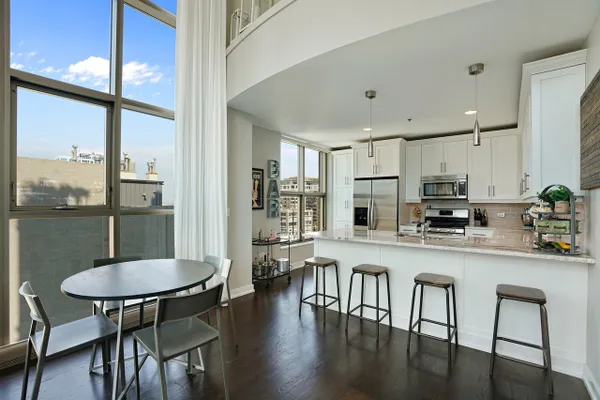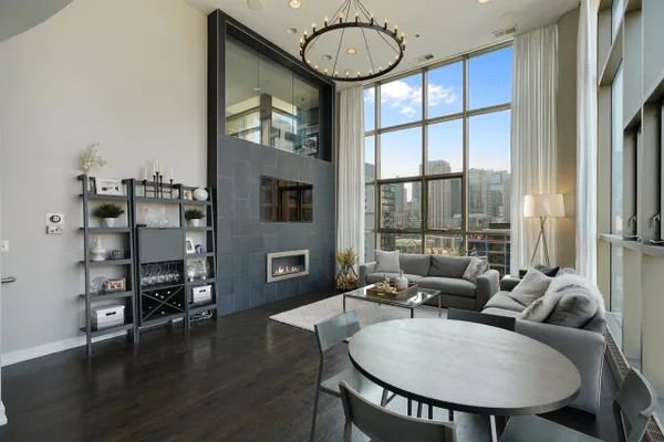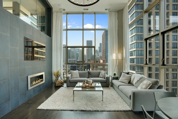 This rare 2 bed/2bath duplex condo in the heart of River North features dramatic 15ft ceilings and massive floor-to-ceiling windows that provide stunning skyline views and a flood of natural light. Ideal floor plan with both bedrooms on the 2nd level! Master bedroom boasts a large walk-in closet and an ensuite marble bathroom with a double sink vanity and an oversized shower. Unit was recently renovated with beautiful white cabinets, princess white quartz countertops, a modern fireplace, custom window treatments, and a large designer chandelier. Other premium features include a balcony with city views, hardwood flooring, stainless-steel appliances, automatic window shades, stackable washer/dryer, dual zone Nest thermostat controls, and a brand new furnace! This well run building offers a 24-hour door man, mail/package room, bike room, extra storage, and more! 1 heated garage parking space is an additional $45k.