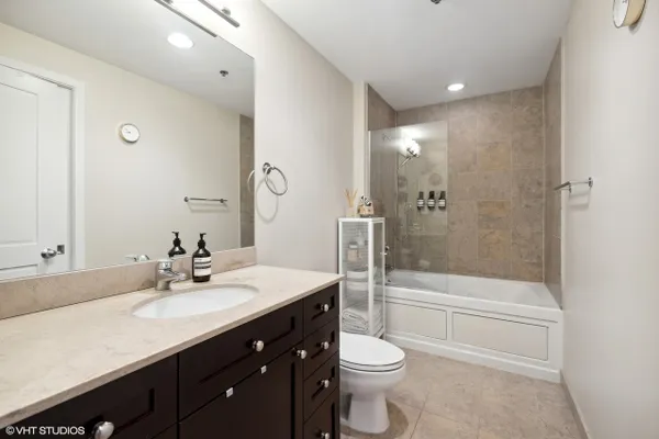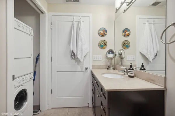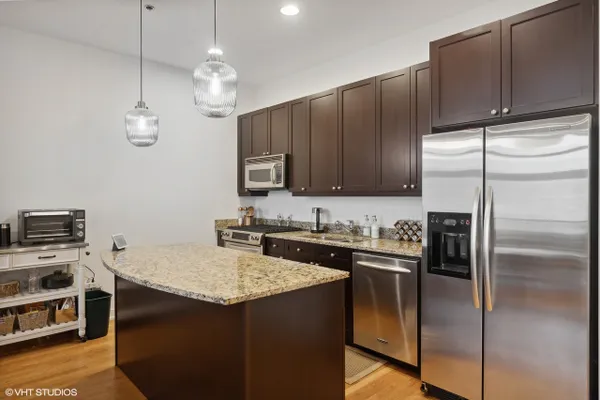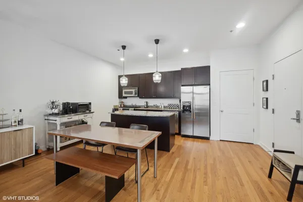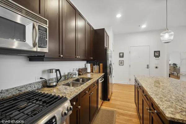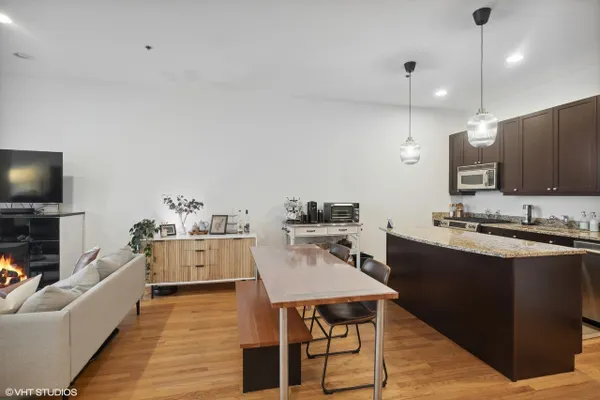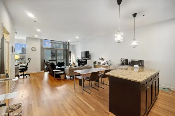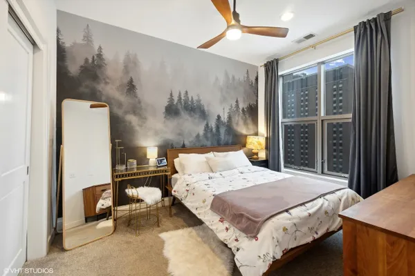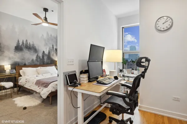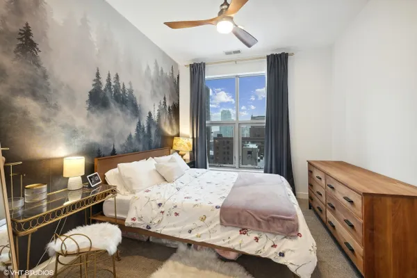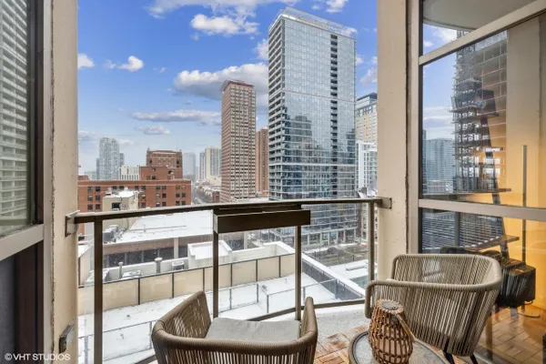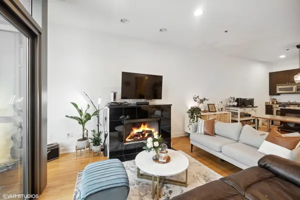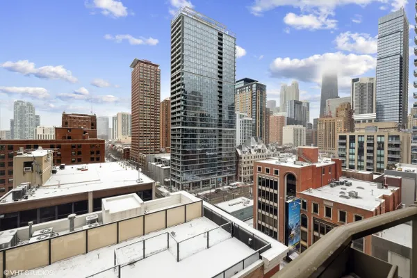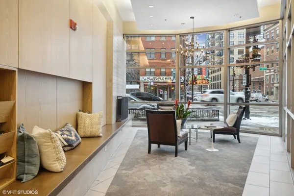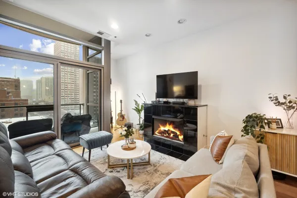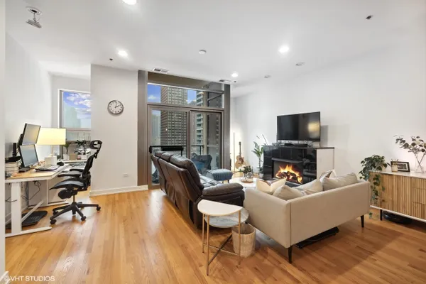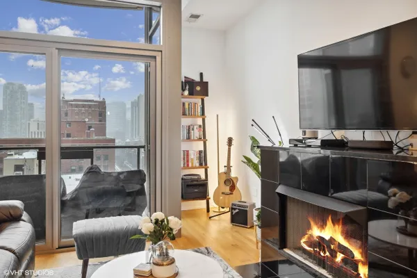 Perfect location River North spacious one bedroom. Abundant light from floor to ceiling windows floods the oversized living room. Great space to entertain or work from home with 2 great desk locations to choose from along with plenty of space for a dining room table. Stay nice and cozy with your gas fireplace surrounded by hardwood oak floors. Luxury finishes throughout as well as custom designed closets perfect for your organizing needs. The nice sized chef's kitchen is perfect for all of your cooking desires featuring Kitchen-Aid stainless appliances, 42" cabinets, granite counter tops and large island. Enjoy upcoming spring Chicago days on your generous sized balcony with north, east, and west city views! Recessed can lighting throughout, high ceilings, and in-unit washer and dryer for your convenience. Boutique building with only 54 units and full-time doorman for superior service and convenience. Minutes away from the Brown, Purple and Red line along with multiple buses. Walk to Avec, Etta, Obelix or old school Club Lago. Attached heated parking available.