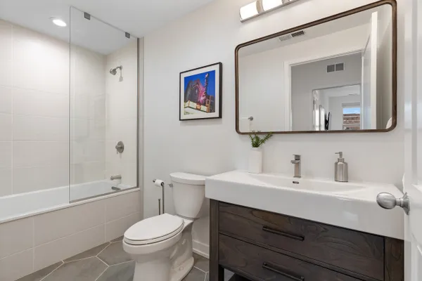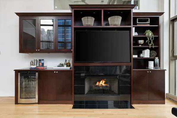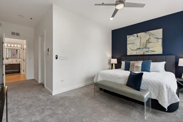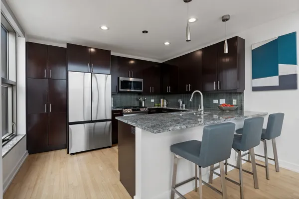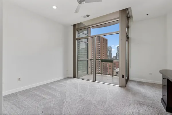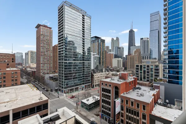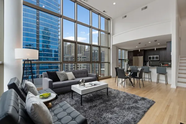 Dramatic Chicago skyline views from floor to ceiling windows in this rare 2 bed/2bath duplex located in boutique doorman building. Featuring 15' ceiling height in the expansive living room, accented with hardwood flooring, custom built-ins, fireplace and wine refrigeration, you will be awed by the iconic views day and night! An open chef's kitchen features 2023 stainless appliances, stone counter tops, backsplash, and dedicated pantry. Ideally situated upstairs is a private primary suite complete with spa bathroom featuring oversized steam shower, dual sinks, and generous custom walk-in closet. Second bedroom contains built-in work station plus a picture window overlooking the living room and skyline. Fully renovated second bathroom, updated LG Washtower, and a balcony complete this move-in ready home. Walk to Whole Foods, Starbucks, Trader Joe's, Shopping, Dining and Transportation. 1 heated garage parking space, $35k.